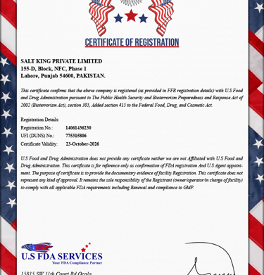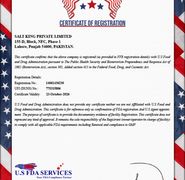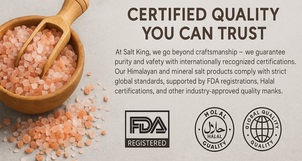 At Salt King, we go beyond craftsmanship — we guarantee purity and safety with internationally recognized certifications. Our Himalayan and mineral salt products comply with strict global standards, supported by FDA registrations, Halal certifications, and other industry-approved quality marks.
